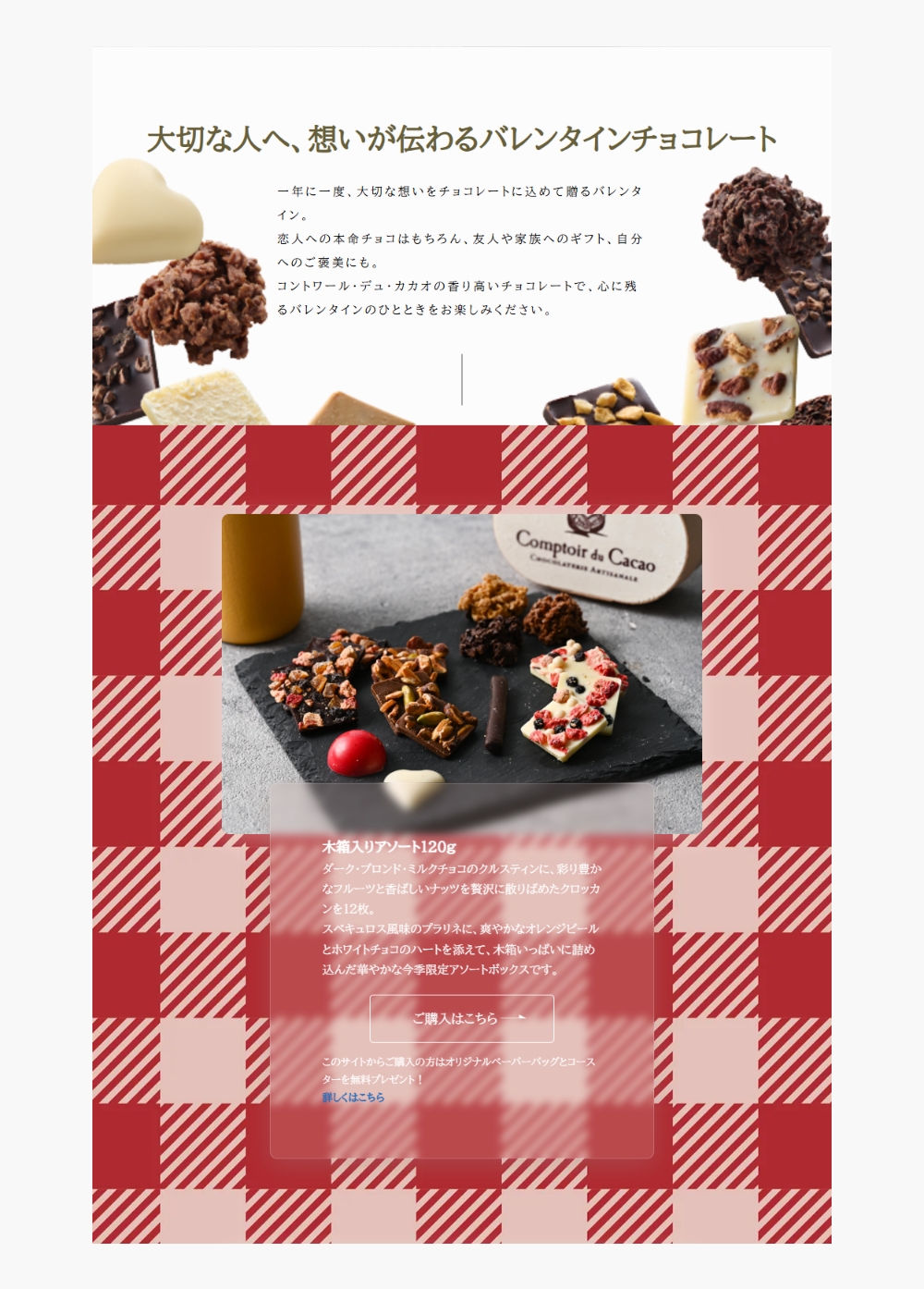 コントワール・デュ・カカオのサイトでは写真が映えるレイアウトになっていて、チェック模様が印象的なデザインに仕上げられています。