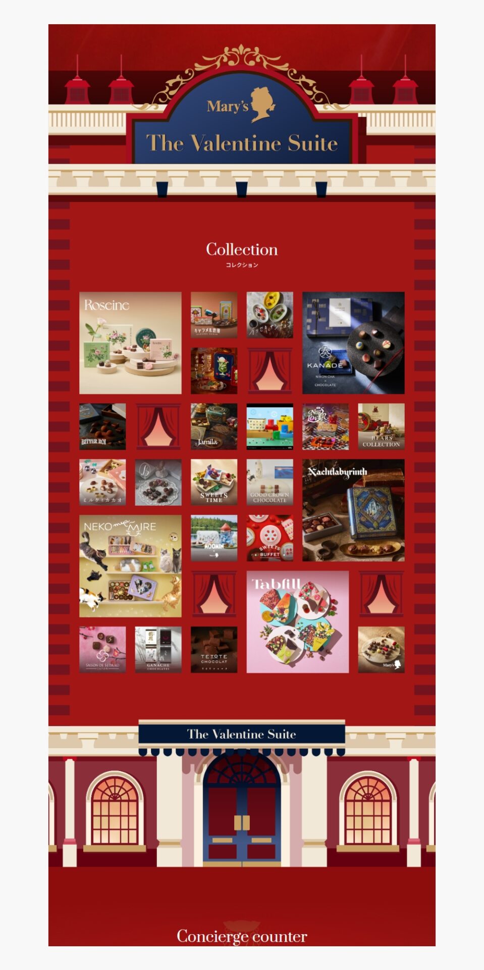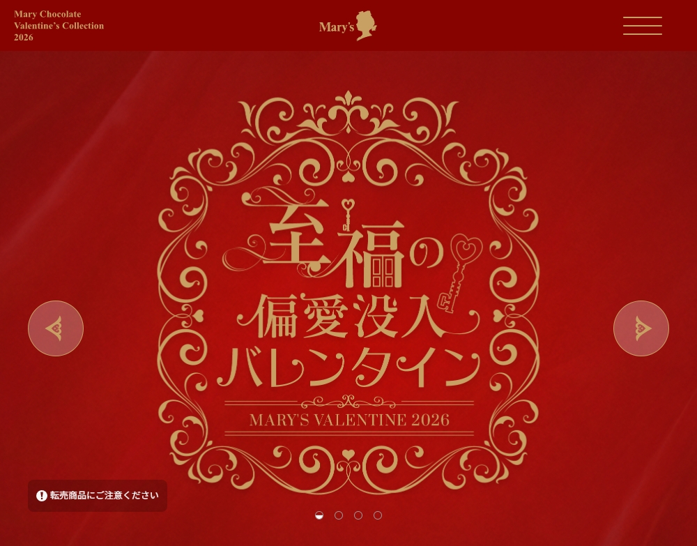 バレンタインのシリーズがたくさん用意されているメリーチョコレート。各ブランドページに遷移できるフロントページという扱いのサイトになります。ブランドページも商品のコンセプトにあったデザインや配色になっていて見応え抜群です。